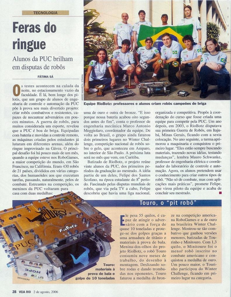 Artigo da Revista VEJA, "Feras do ringue", sobre disputa de robôs, com o prof. Marco Antonio Meggiolaro (MEC) e alunos. Foto do robô Touro.