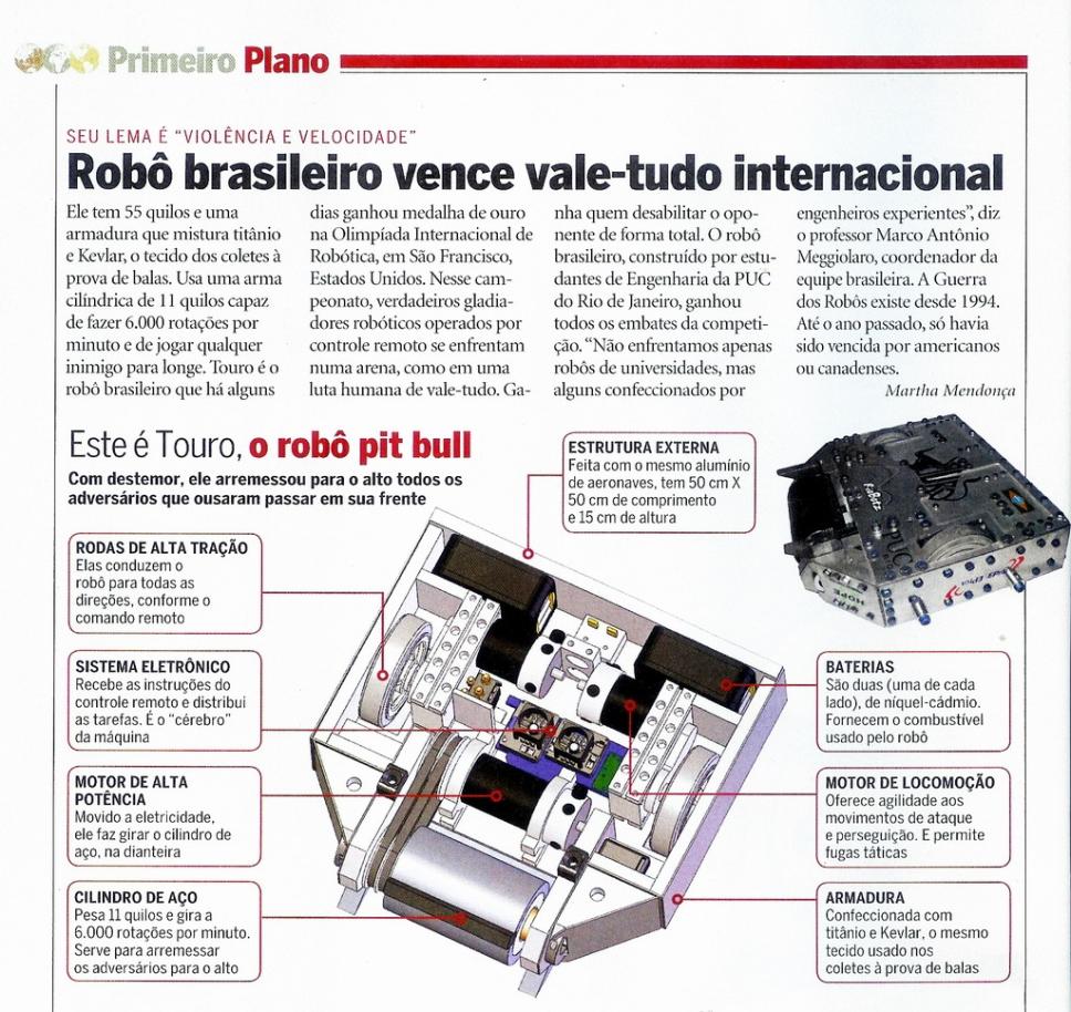 Artigo da Revista Época, "Robô brasileiro vence vale-tudo internacional". "Seu lema é 'violência e velocidade'", o "Robô pit bull". Diagrama do robô Touro.