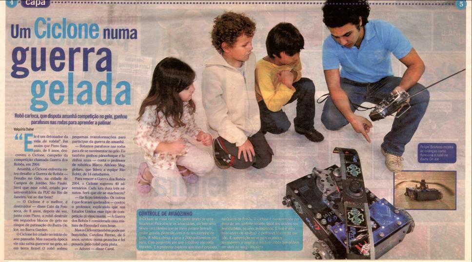 Artigo do suplemento Globinho, do O Globo: "Um Ciclone numa guerra gelada". Imagem do robô Ciclone com crianças.