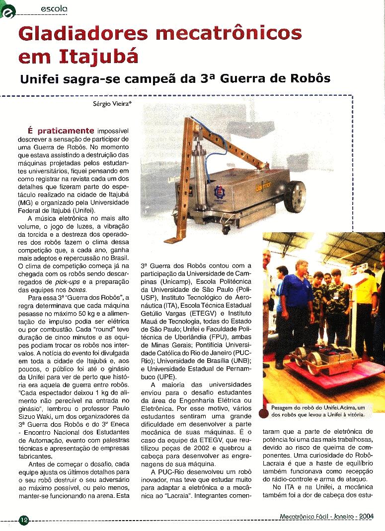 Coleção Laboratório de Robótica - Riobotz Código exclusivo ak0001_043 Data da criação Mês 1 Ano 2004 Data de criação Qui, 01/01/2004 - 12:00 Natureza do documento imagem Tipo de documento jornal Referente a Laboratório de Robótica (MEC) Identificação Original 04_Mecatronica_facil Local n.a. Descrição Artigo da Revista Mecatrônica Fácil, "Gladiadores mecatrônicos em Itajubá". Palavras-chave robô, robótica Autores/Criadores Sergio Vieira