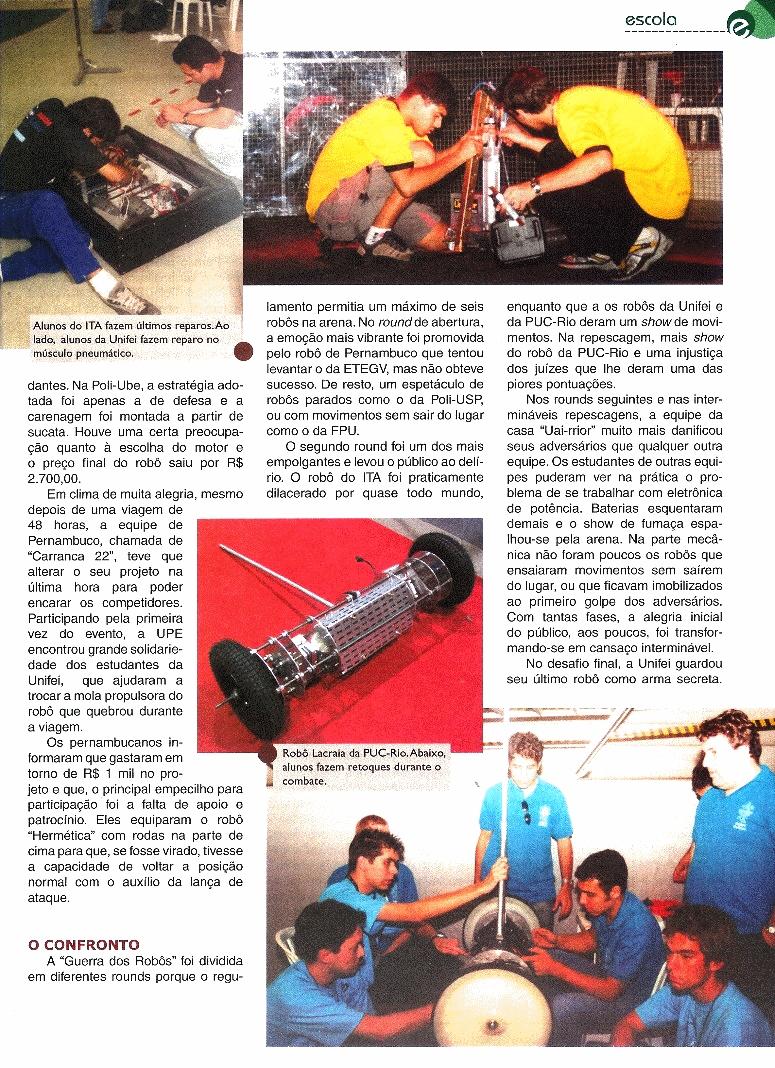 Artigo da Revista Mecatrônica Fácil, "Gladiadores mecatrônicos em Itajubá". Foto da equipe da PUC-Rio.