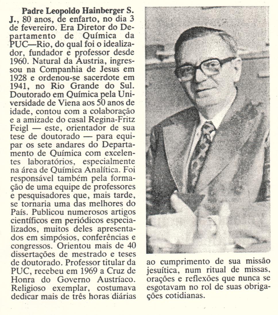 Obituário do Pe.Leopoldo Hainberger S.J. publicado no Jornal da PUC.