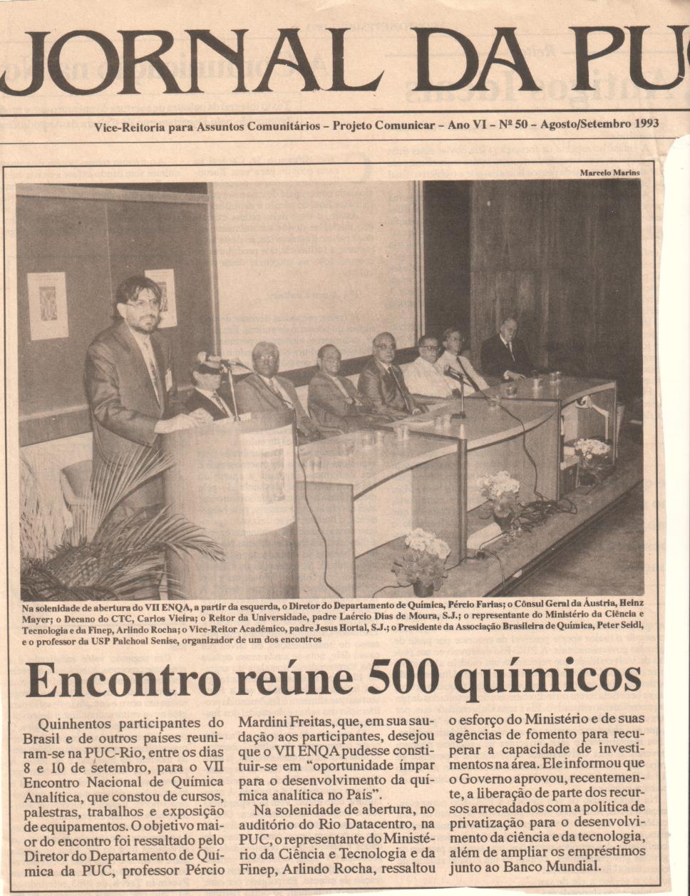 Artigo do Jornal da PUC sobre o VII ENQA, Encontro Nacional de Química Analítica, 8 a 10 de setembro de 1993. Fotografia da mesa de abertura do evento.