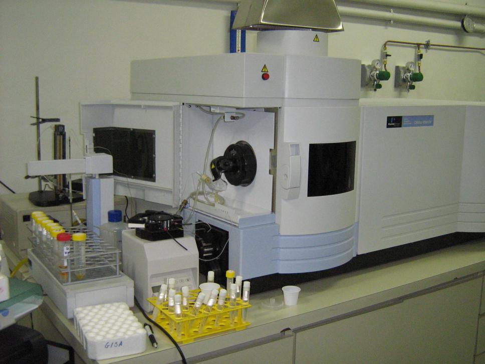 Equipamentos dos laboratórios, tubos de ensaio. Espectrômetro Perkin Optima 4300 DV.