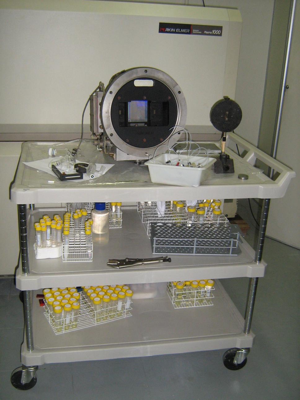 Equipamentos dos laboratórios, tubos de ensaio, carrinho de transporte. Espectrômetro Perkin Elmer - Plasma 1000.