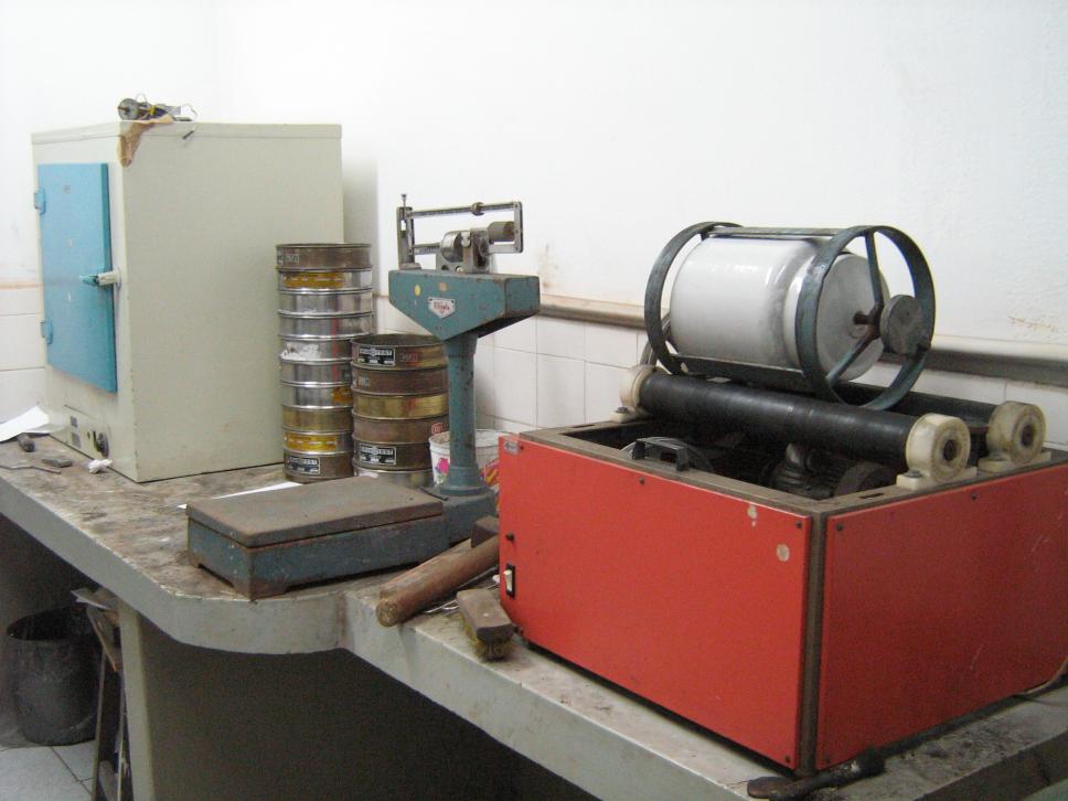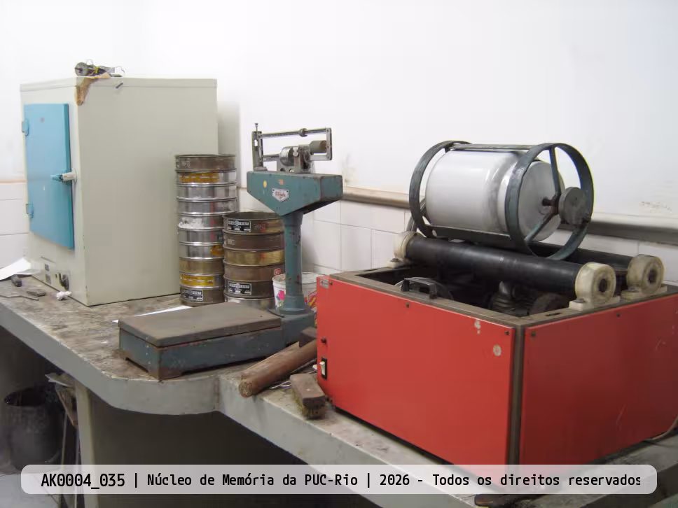 Laboratório de Engenharia Metalúrgica, localizado na casa XXI da Vila dos Diretórios. Autoclave, peneiras, balança Filizola, marreta e equipamento não identificado.