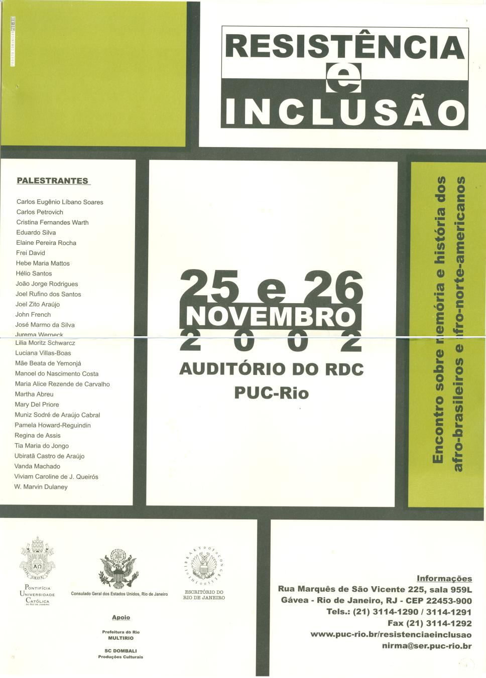 Cartaz de encontro Resistência e Inclusão, sobre memória e história dos afro-brasileiros e afro-norte-americanos. Apoio do Consulado Geral dos Estados Unidos, da Library of Congress e da Multirio. 25 e 26/11/2002, auditório do RDC.