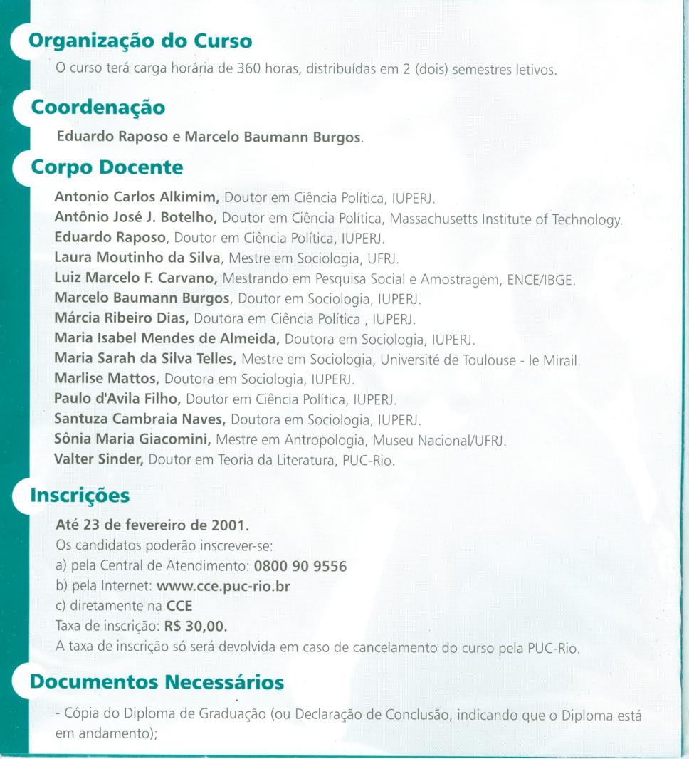 Folheto sobre o curso de Pós-Graduação Lato Sensu do Departamento de Sociologia e Política