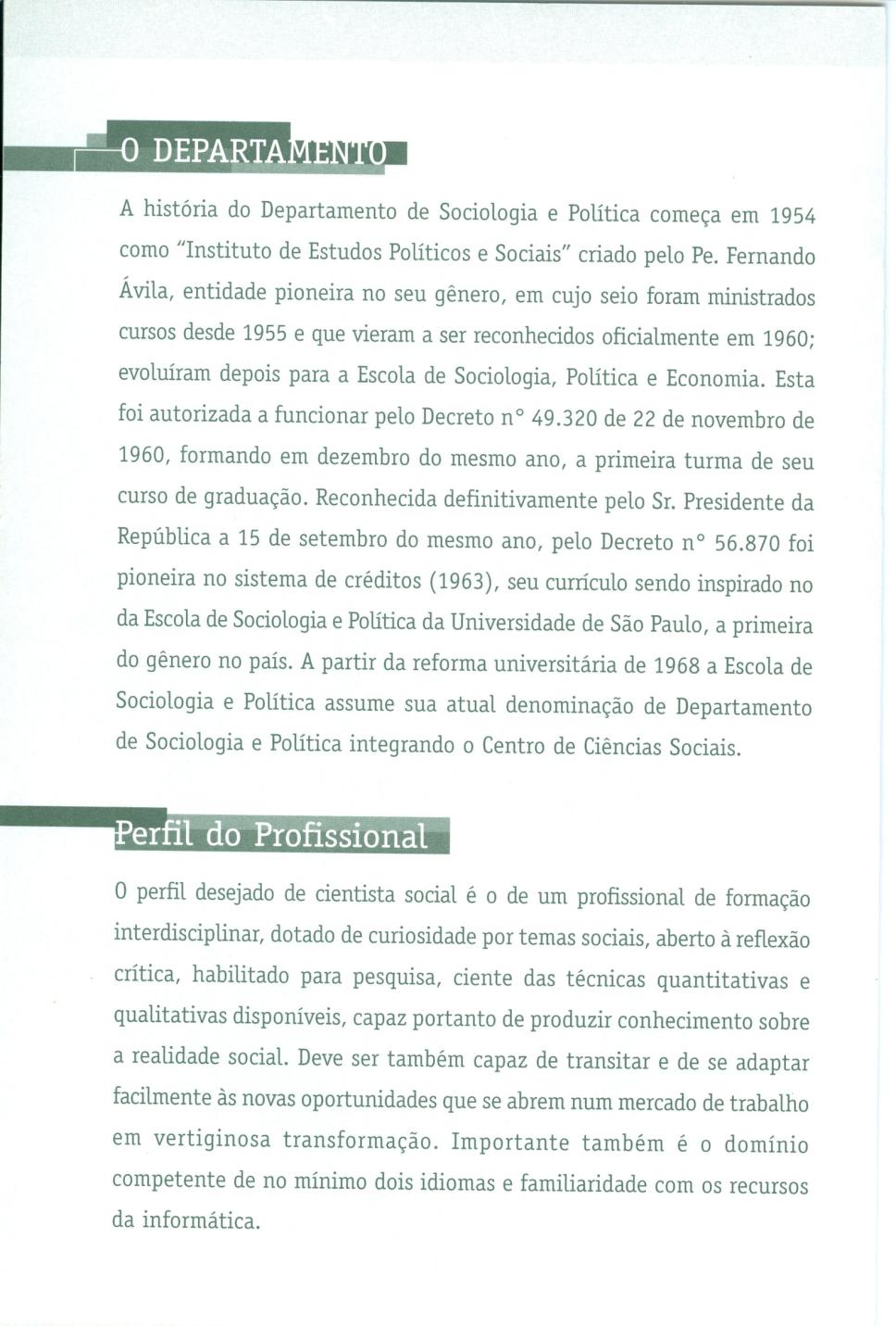 Folheto sobre o Departamento de Sociologia e Política, página 1. Sobre o departamento, história (Instituto de Estudos Políticos e Sociais) e perfil do profissional em Sociologia.