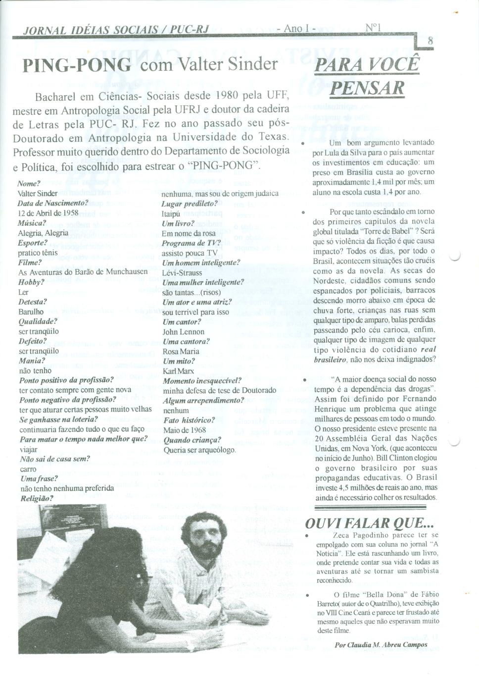 Página 08, ano 1, num. 1, Julho/1998. "PING-PONG com Valter Sinder", entrevista com o professor do Departamento de Sociologia. Foto de Valter Sinder durante a entrevista. Coluna "Para Você Pensar", com pequenos tópicos. Coluna "Ouvi Falar Que...", com notas sobre cultura. Assinado por Claudia M. Abreu Campos.