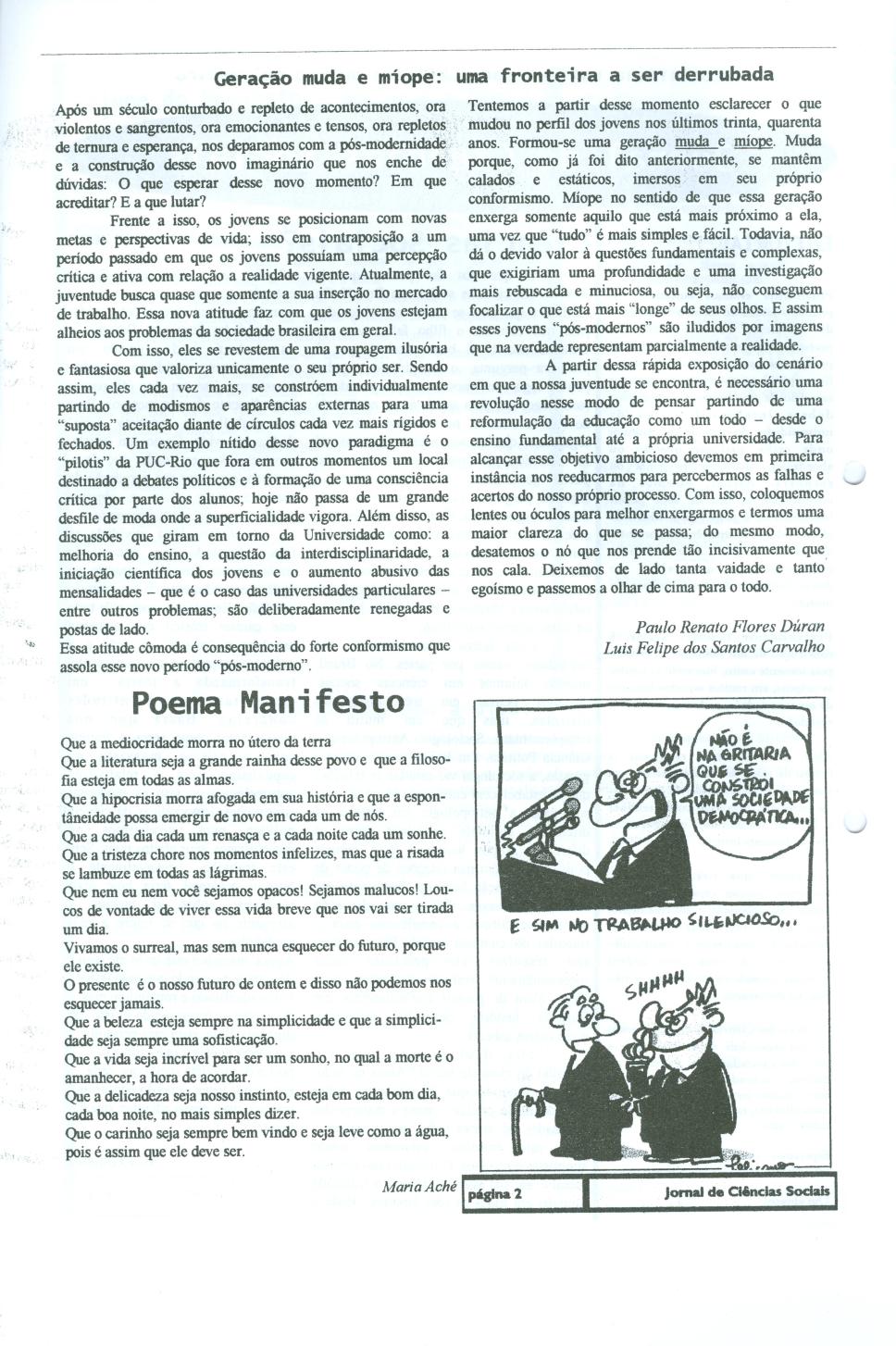 Página 02, num. zero. Matérias "Geração muda e míope: uma fronteira a ser derrubada", assinada por Paulo Renato Flores Duran e Luis Felipe dos Santos Carvalho, e "Poema Manifesto", assinado por Maria Aché. Charge assinada por Pelicano.