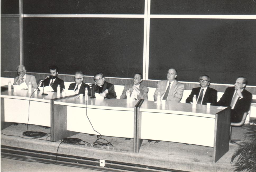 Na mesa da esq. para dir.: n.i., prof. Paulo Fernando Carneiro de Andrade (TEO, decano do CTCH), prof. pe. Pedro Magalhães Guimarães Ferreira S.J. (ELE), prof. pe. Jesús Hortal Sànchez S.J. (TEO, Reitor), pe. Laércio Dias de Moura S.J. (Reitor), prof. Nelson Janot Marinho (Vice-Reitor para Assuntos de Desenvolvimento), prof. Augusto Sampaio (Augusto Luiz Duarte Lopes Sampaio) (COM, Vice-Reitor para Assuntos Comunitários)