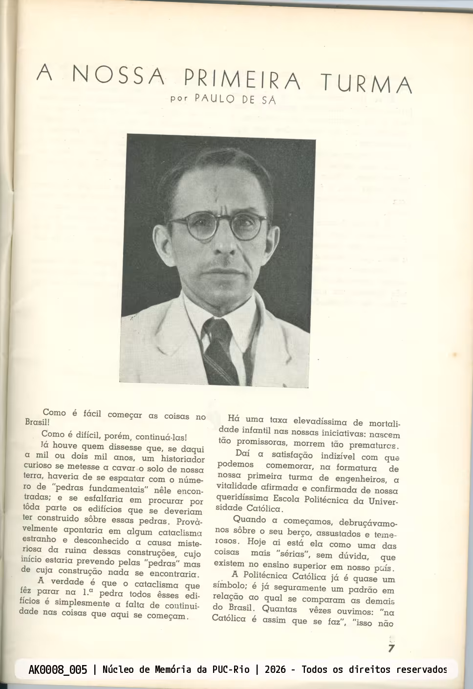 Página 7 - Artigo "A Nossa Primeira Turma", pelo prof. Paulo de Sá (engenheiro), sobre as dificuldades de iniciar um projeto no Brasil e como a Escola Politécnica trabalhou para seu sucesso.