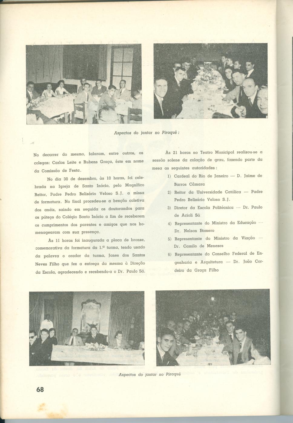 Continuação dos detalhes sobre a festa de formatura, com fotos do jantar no Clube Piraquê. A sessão solene ocorreu no Teatro Municipal do Rio de Janeiro, em 30/12/1952, com a presença do Cardeal D. Jaime de Barros Câmara, do Reitor pe. Velloso S.J., do diretor da EPUC prof. Paulo Sá e de representantes dos ministérios da Educação e da Viação e do Conselho Federal de Engenharia e Arquitetura.