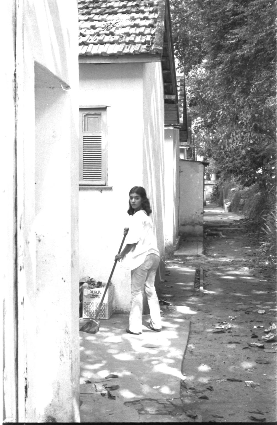 Aluna varre o chão nos fundos da Vila dos Diretórios.