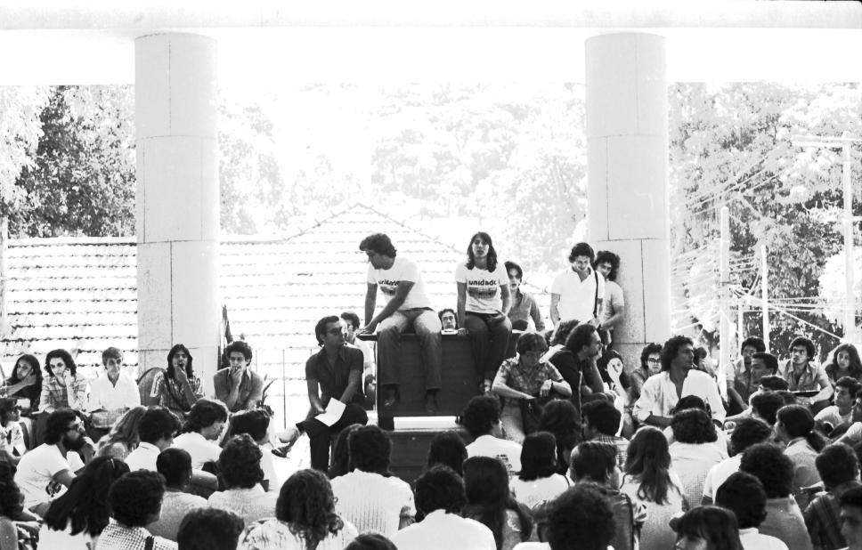 Alunos reunidos no pilotis com membros da Chapa Unidade em palanque, no aguardo da chegada de Miguel Arraes. Ao fundo, a Vila dos Diretórios.
