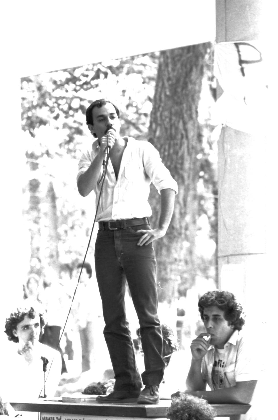 Aluno discursa em palanque, no aguardo da chegada de Miguel Arraes.