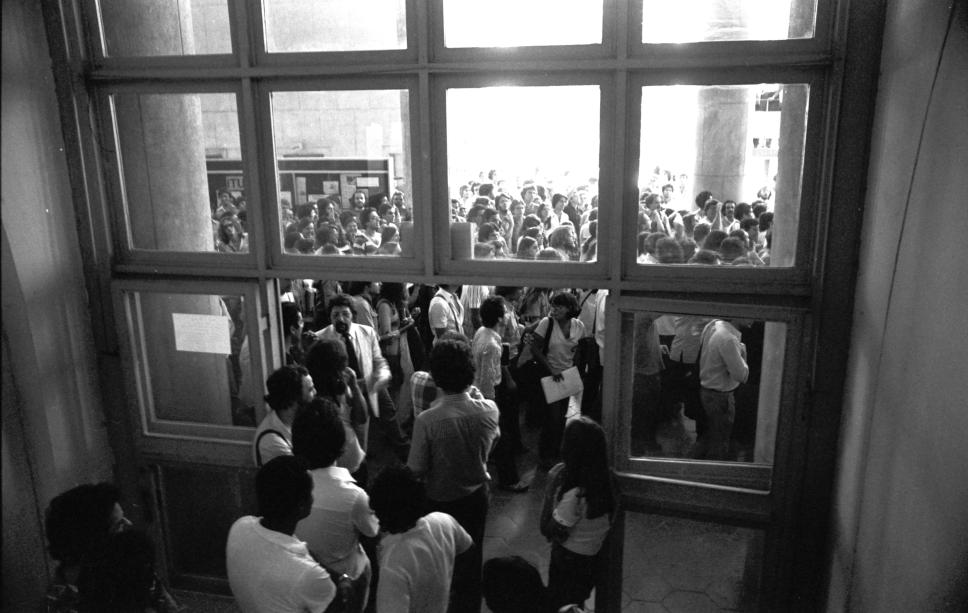Alunos reunidos no pilotis aguardam Miguel Arraes. A foto foi tirada de dentro de um dos laboratórios do ITUC.