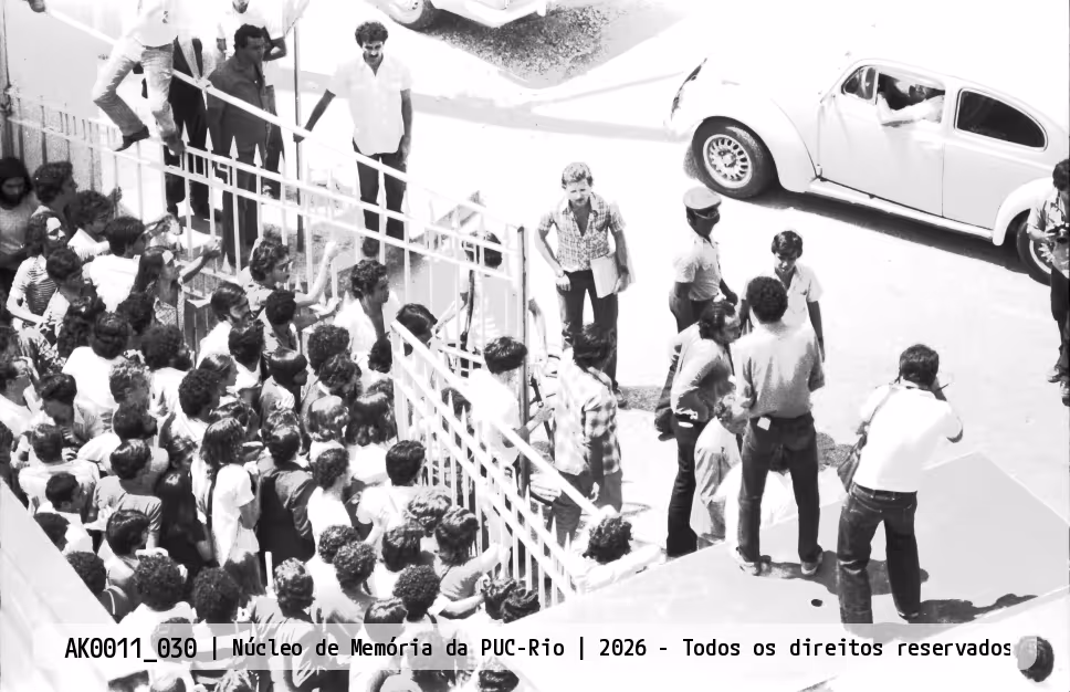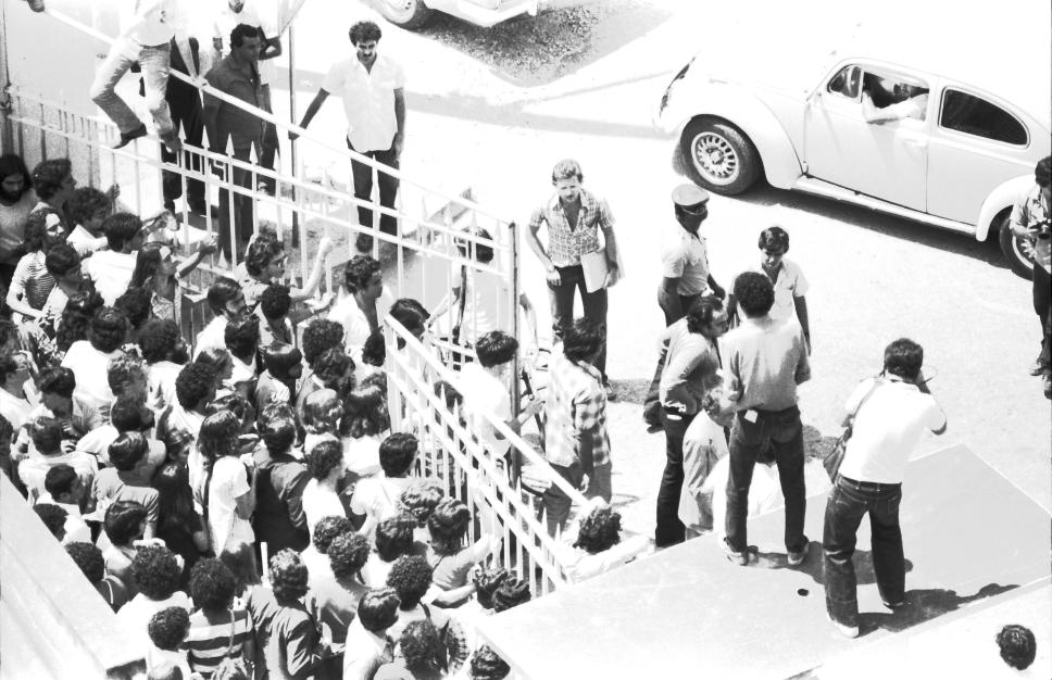 Alunos reunidos na frente do portão de entrada da PUC-Rio, na tentativa de permitir a entrada de Miguel Arraes (na foto, do lado direito já dentro da Universidade) e do restante dos estudantes.