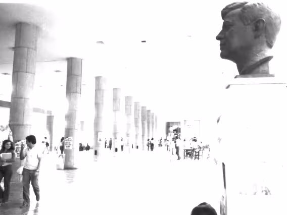 Fotos de contagem de votos, realizada no Ginásio, das eleições estudantis de 1979 e de alunos nos pilotis da PUC-Rio durante as eleições.