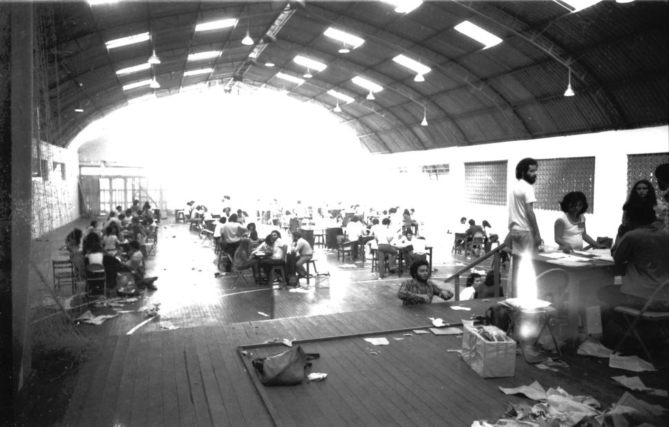 Visão ampla do Ginásio, com os estudantes em mesas na contagem de votos das eleições estudantis.