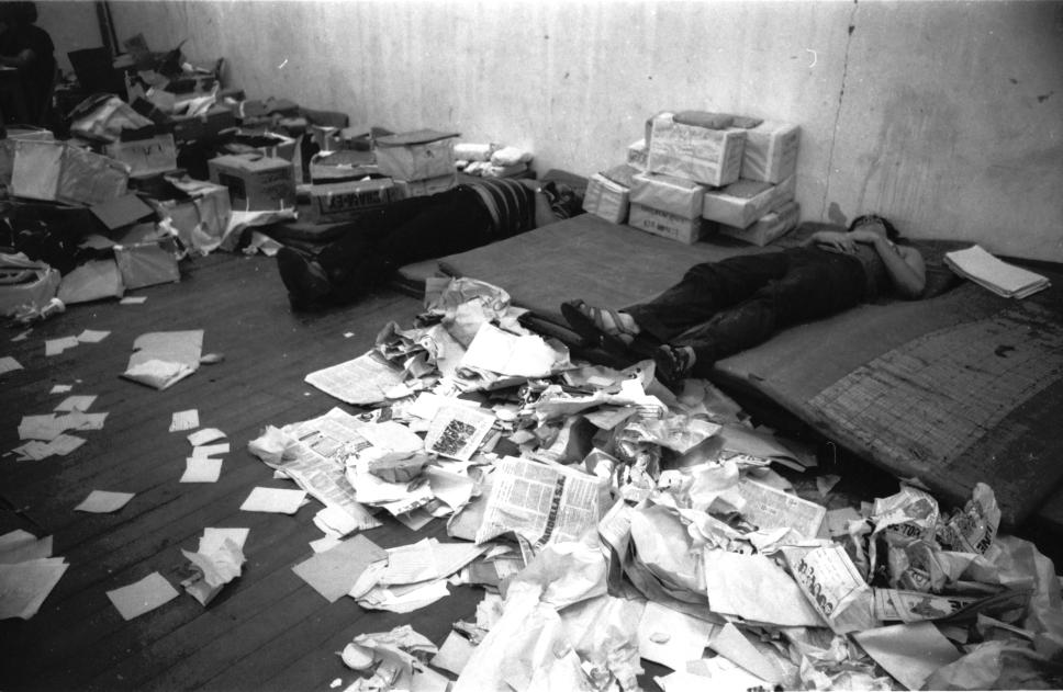 Alunos deitados em tatames no Ginásio, cercados de jornais, papeis e caixas de votos.