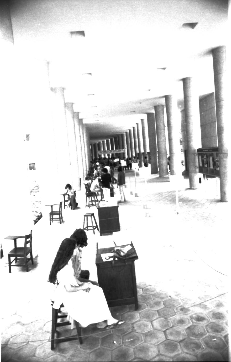 Eleições estudantis. Mesas de votação. Faixa escrita "Unidade - UNE - UEE", vista por trás.