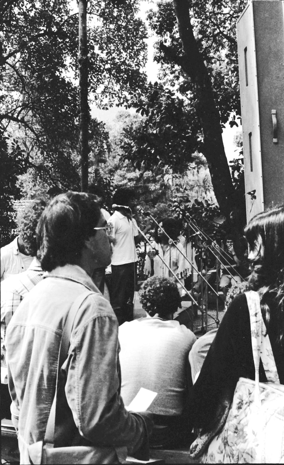 Grupo de alunos em sarau; apresentação vocal em palco improvisado.