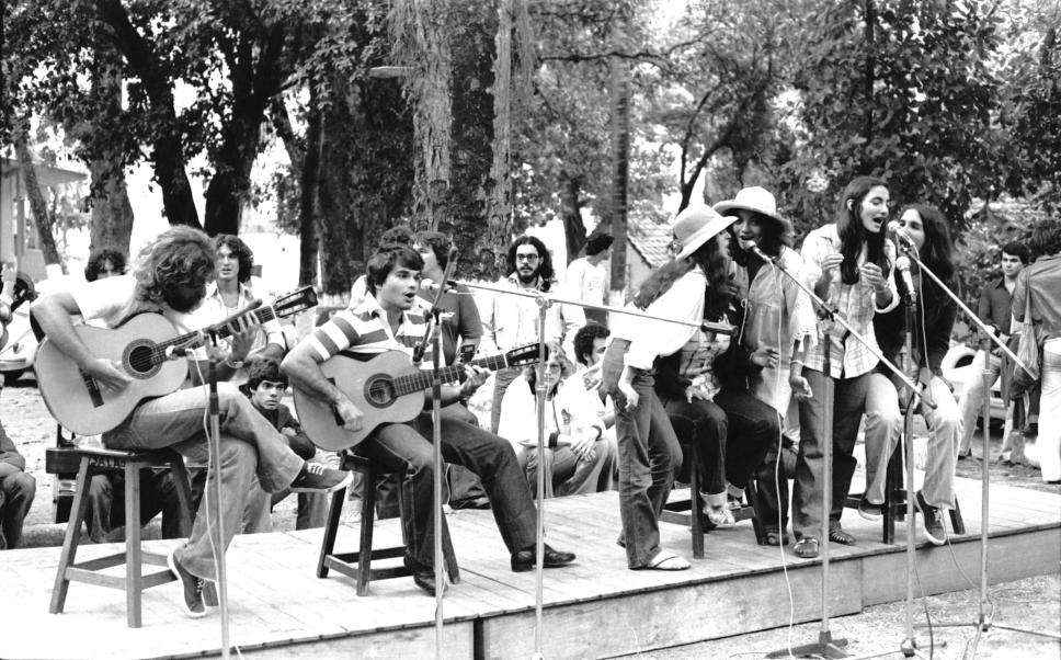 Grupo de alunos em sarau; apresentação com violões e vocal.