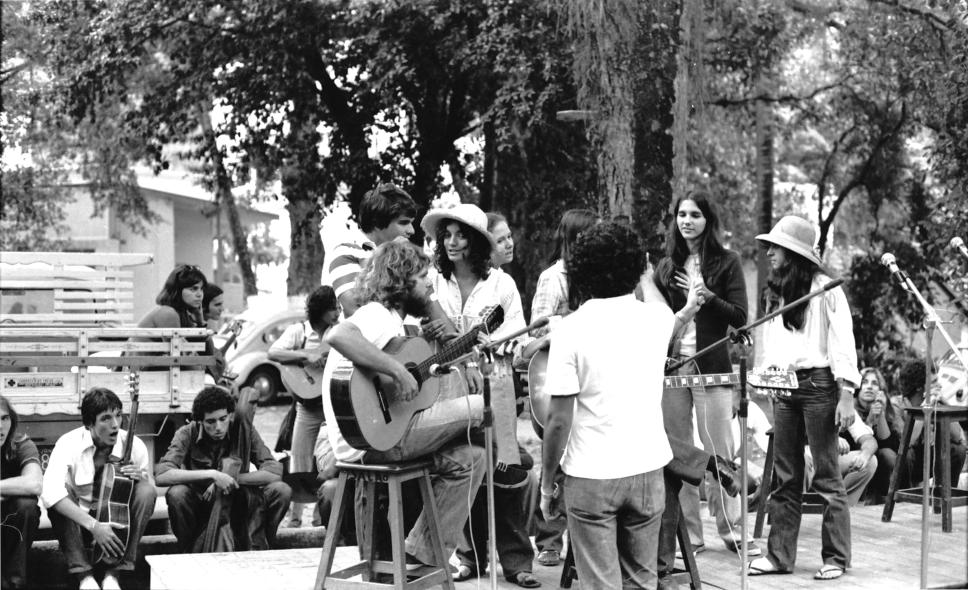 Grupo de alunos em sarau; apresentação com violões e vocal.