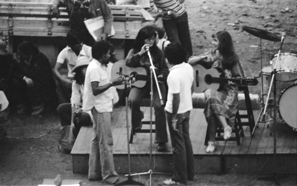 Grupo de alunos em sarau; preparam-se para apresentação com violões e vocal.