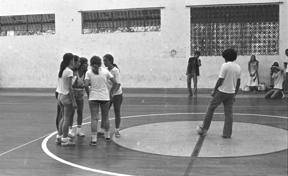 Alunas jogam futebol de salão. Conversam sobre a tática do jogo. Aluno filma em Super 8.
