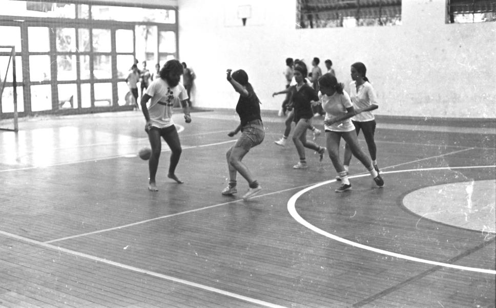Alunas jogam futebol de salão. Um rapaz se intromete.