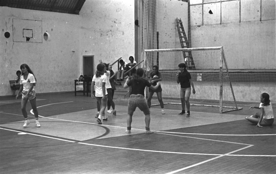 Alunas jogam futebol de salão. Comemoram a defesa da goleira.