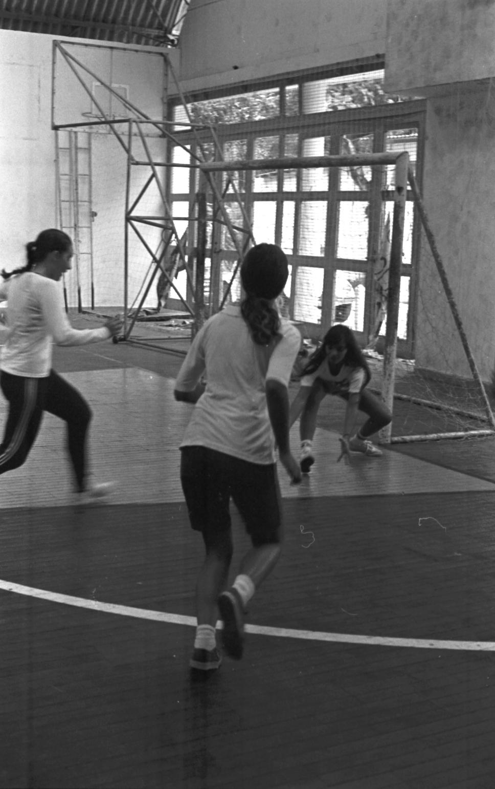 Alunas jogam futebol de salão.