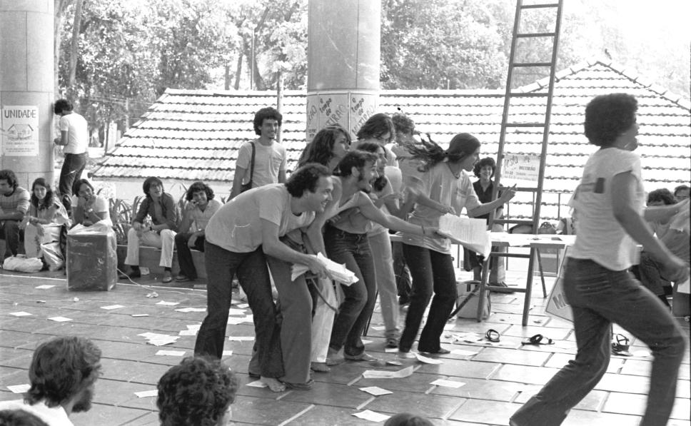 Performance teatral durante a campanha das chapas para o DCE. Cartazes e faixas das chapas Mutirão e Unidade.