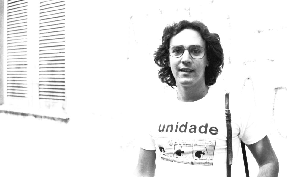 Estudante com camiseta da chapa Unidade com desenho da Mafalda.