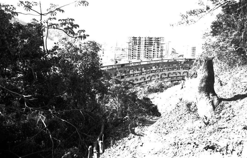 Vista do morro atrás do Minhocão. Obras para construção do túnel acústico da Auto-estrada Lagoa-Barra.
