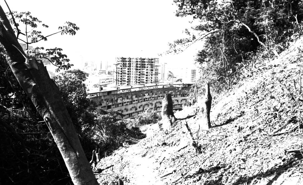 Vista do morro atrás do Minhocão. Obras para construção do túnel acústico da Auto-estrada Lagoa-Barra.