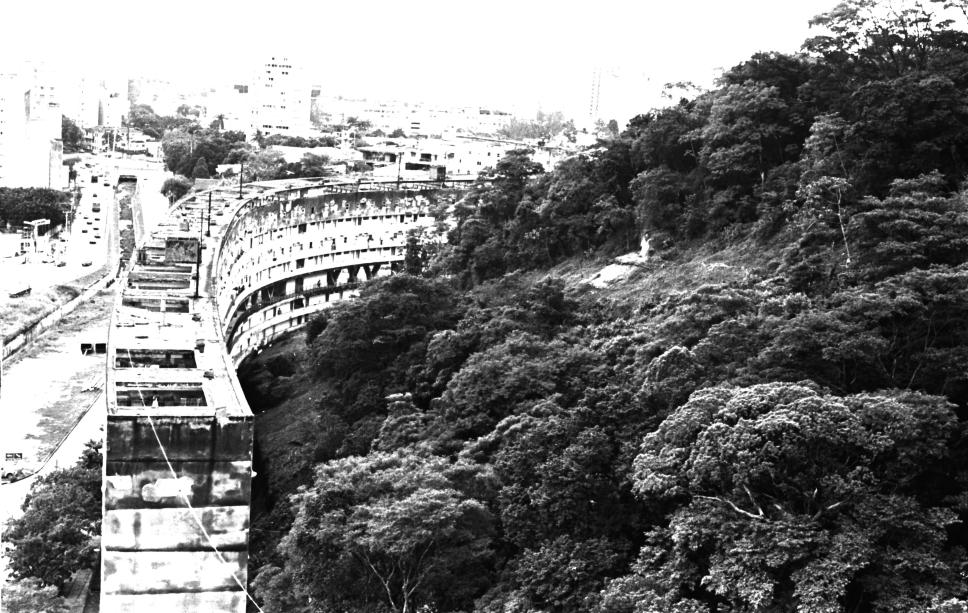 Vista do Minhocão, da Av. Padre Leonel Franca e da Praça Sibélius a partir do alto do Edifício Cardeal Leme, durante a construção do túnel acústico da Auto-estrada Lagoa-Barra.