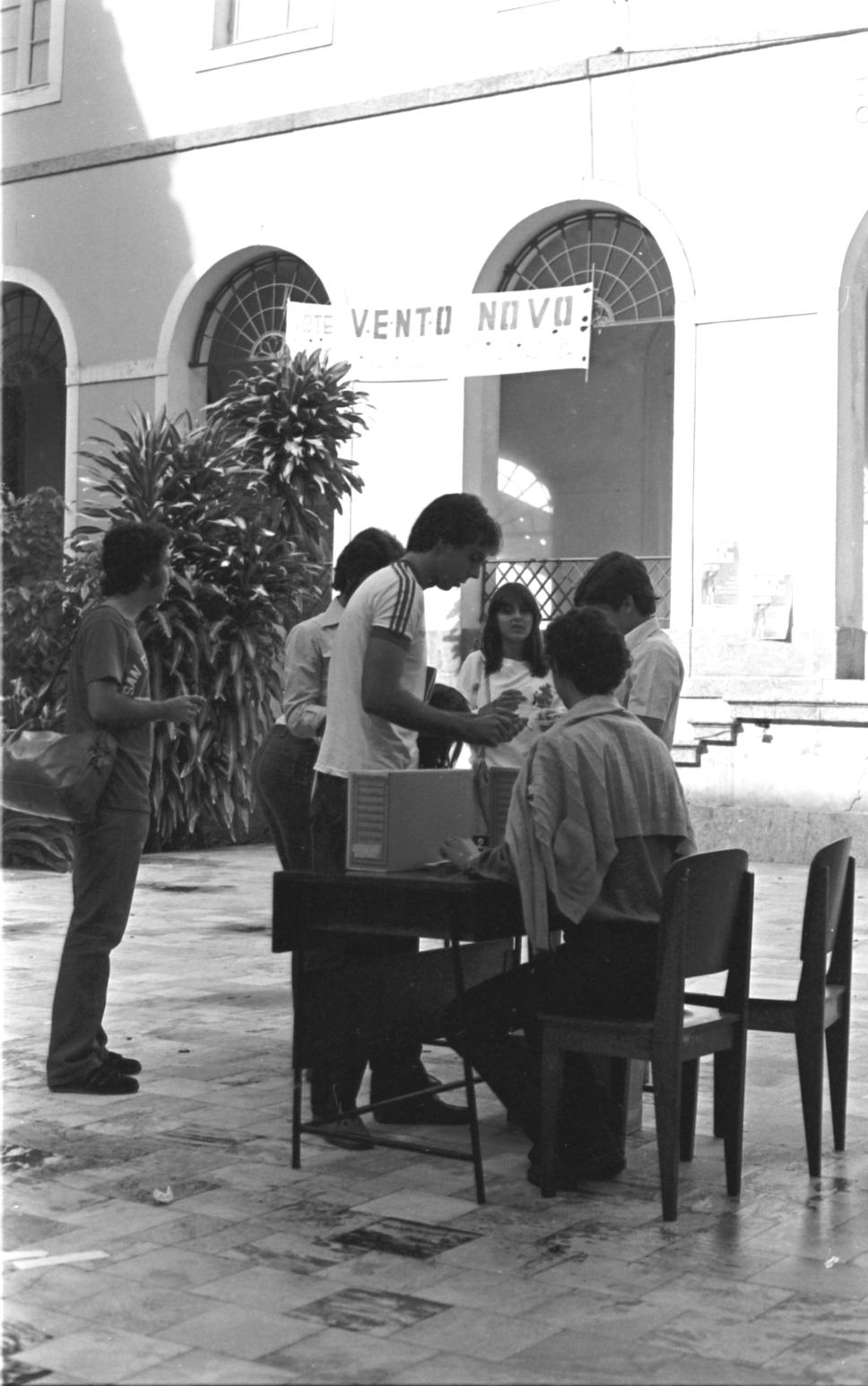 Eleições para UNE e UEE, no anfiteatro da Faculdade de Economia, Praia Vermelha, UFRJ. Faixa da chapa Vento Novo.
