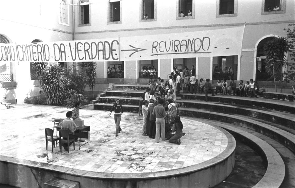 Eleições para UNE e UEE, no anfiteatro da Faculdade de Economia, Praia Vermelha, UFRJ. Faixa da chapa Revirando.
