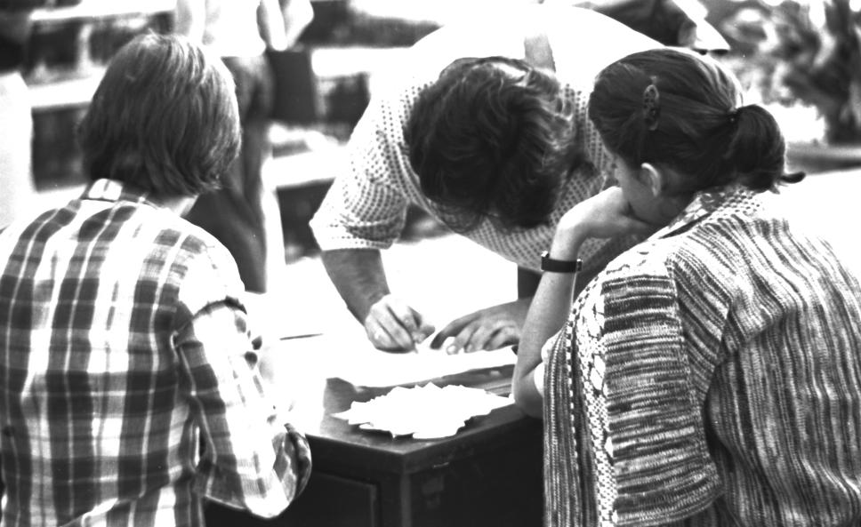 Eleições para UNE e UEE, no anfiteatro da Faculdade de Economia, Praia Vermelha, UFRJ. Mesa de votação.