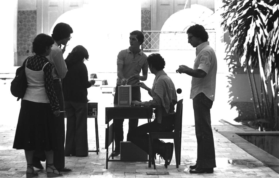Eleições para UNE e UEE, no anfiteatro da Faculdade de Economia, Praia Vermelha, UFRJ. Mesa de votação.
