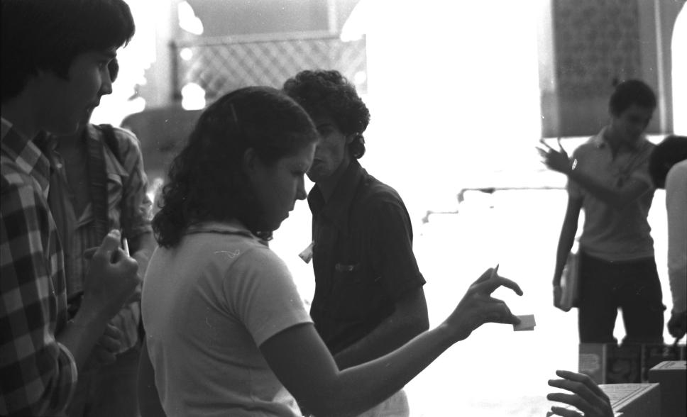 Eleições para UNE e UEE, no anfiteatro da Faculdade de Economia, Praia Vermelha, UFRJ. Mesa de votação.