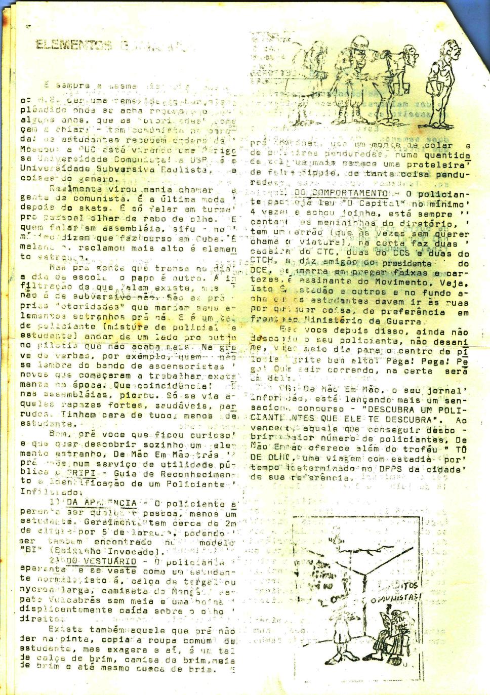 Reportagem. Jornal do CTC da chapa Alternativa, do movimento estudantil da PUC-Rio, número 02. "Guia de reconhecimento e identificação de um policiante infiltrado".