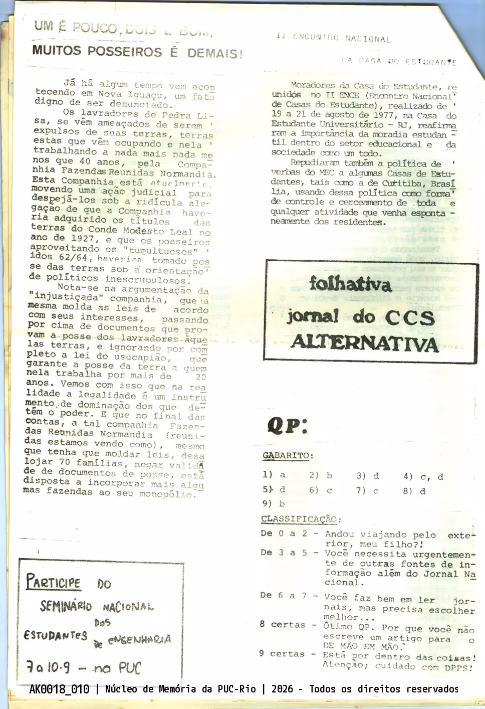 Jornal do CTC da chapa Alternativa do movimento estudantil da PUC-Rio, número 02. Anúncio do jornal Folhativa, jornal do CCS da chapa Alternativa. Artigo: Um é pouco, dois é bom, muitos posseiros é demais. II Encontro Nacional da Casa do Estudante. O Seminário Nacional dos Estudantes de Engenharia ocorrera na PUC entre 07 e 10 de setembro.
