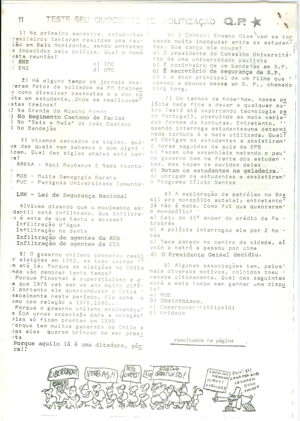 Matéria: Teste seu Quociente de Politização, com 9 perguntas em múltipla escolha e respostas em página anterior (registro ak0018_010). Jornal do CTC da chapa Alternativa, do movimento estudantil da PUC-Rio, número 02.