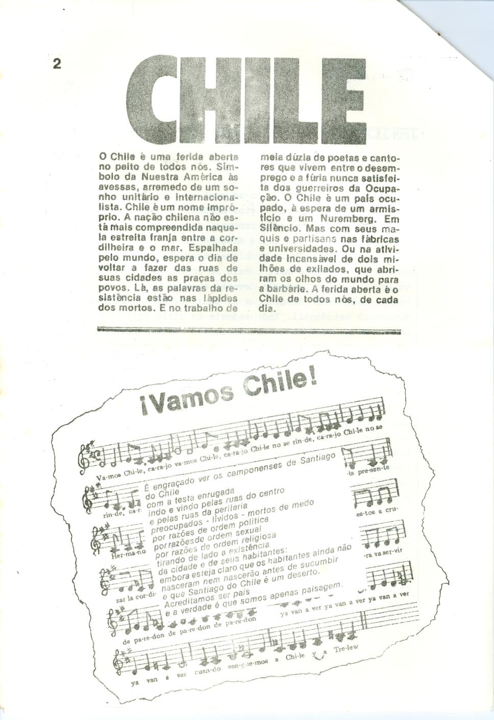 Sobre a situação política no Chile: artigo e letra de música. Jornal da chapa Alternativa, do CTC, do movimento estudantil da PUC-Rio, número 03.