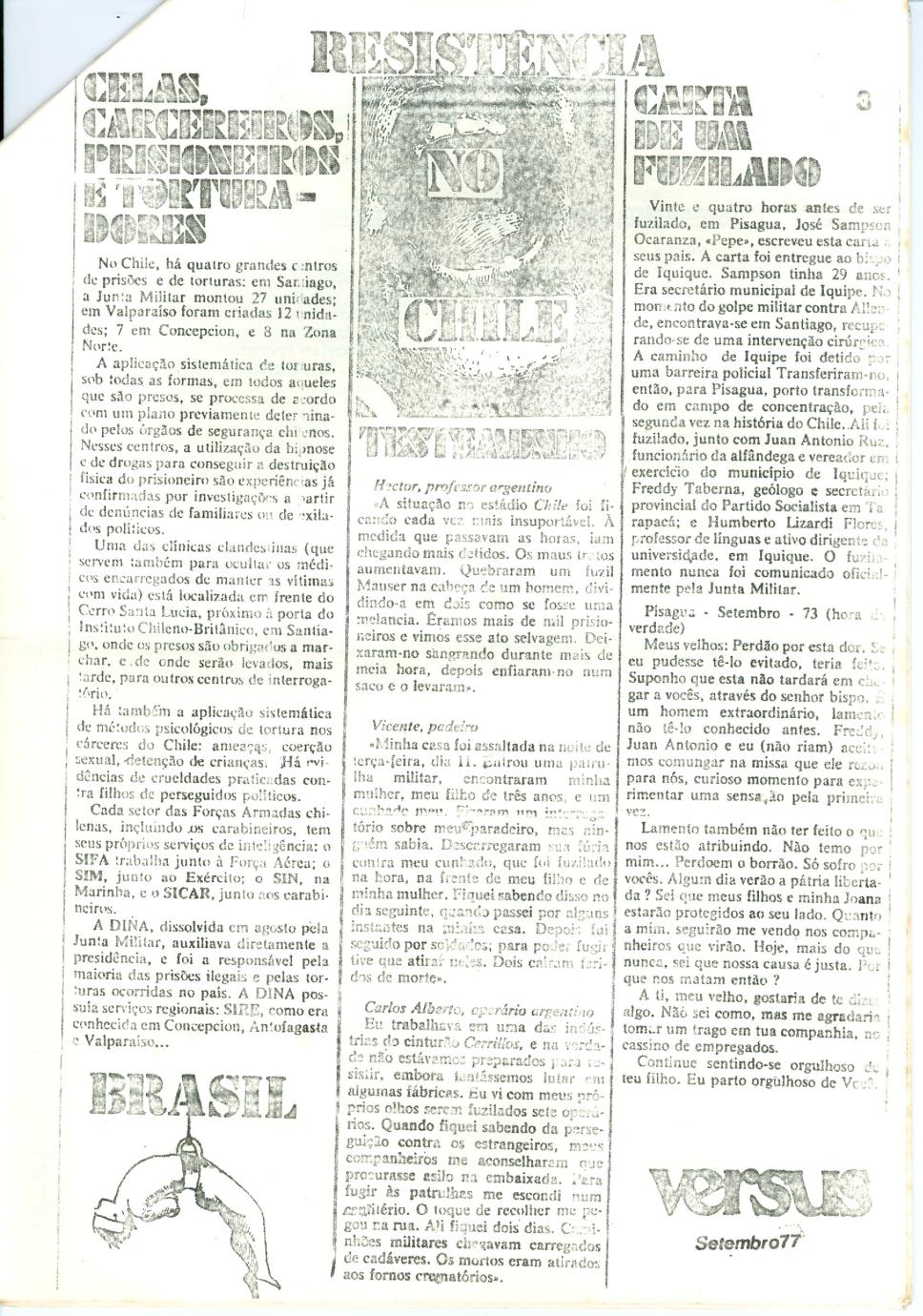 Artigos sobre o Chile. Jornal da chapa Alternativa, do CTC, do movimento estudantil da PUC-Rio, número 03. "Resistência no Chile"; "Celas, Carcereiros, Prisioneiros e Torturadores"; "A Carta de um Fuzilado".